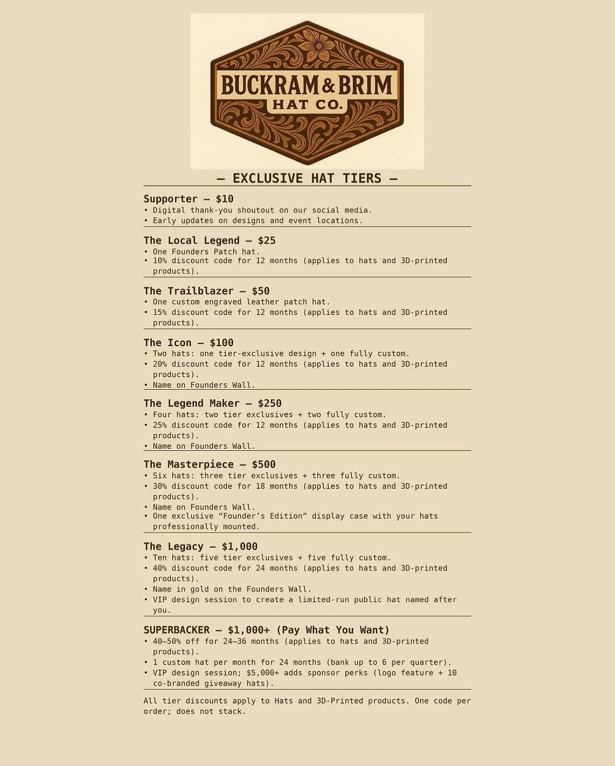 This is the all-in pledge. SUPERBACKERS get: 40–50% discount for 24–36 months (hats and 3D-printed products), One custom hat per month for 24 months (bank up to six per quarter), A VIP design session, And if your pledge exceeds $5,000, sponsor perks: logo placement + 10 co-branded giveaway hats. Superbackers also enjoy first look access to every new product we release, with the ability to order before the general public. This is the tier for those who want to help write the next chapter of Buckram & Brim.